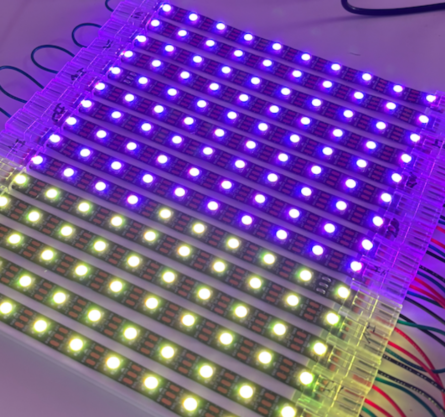 Now that I had a small prototype, I started putting together the final device, which was pretty straight forward since I had already figured out most of the problems in the prototype. The only big mistake I ended up making was how I ran the power to the strips. Instead of just looping the power between each row like I did with the signal pin, I ended up running a power and ground to each row individually which is kind of a mess; if I did this again, I would definitely loop the power.